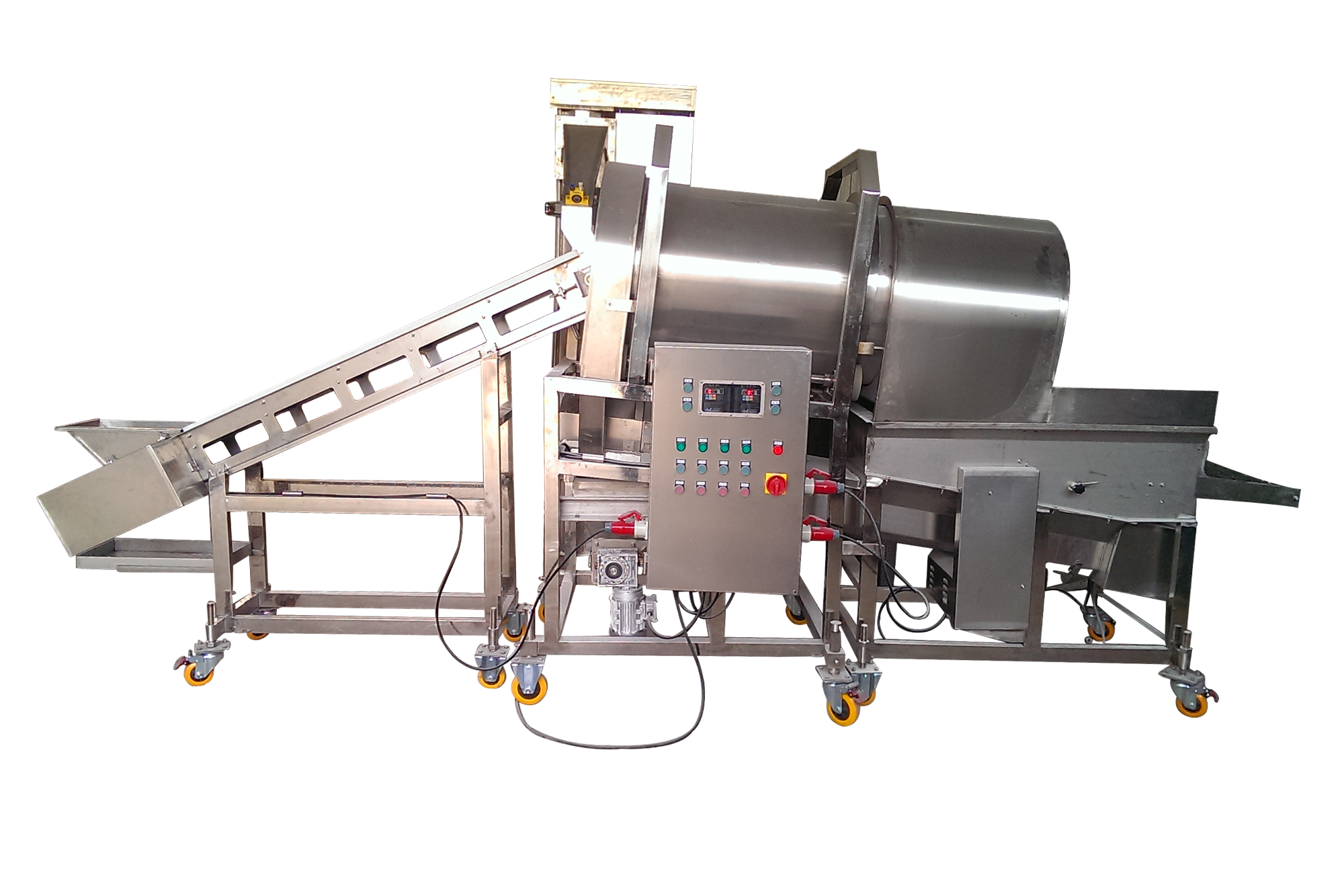 塊狀原料經(jīng)過提升機(jī)輸送機(jī)提升至滾筒內(nèi);滾筒滾動時原料與粉料充分混合,粉料被均勻地包裹在原料表面上;多余粉料經(jīng)過滾筒后端時通過滾筒篩網(wǎng)孔漏掉,而產(chǎn)品落在輸出網(wǎng)帶機(jī)上;網(wǎng)帶機(jī)設(shè)有附粉振動機(jī)構(gòu),可以將產(chǎn)品表面多余的附粉振落,最后將產(chǎn)品輸送到下一工序??梢酝蠞{機(jī)、上粉機(jī)連接,組成不同產(chǎn)品的生產(chǎn)線。從而完成粉、漿、粉,漿、粉及漿、粉、粉工藝。