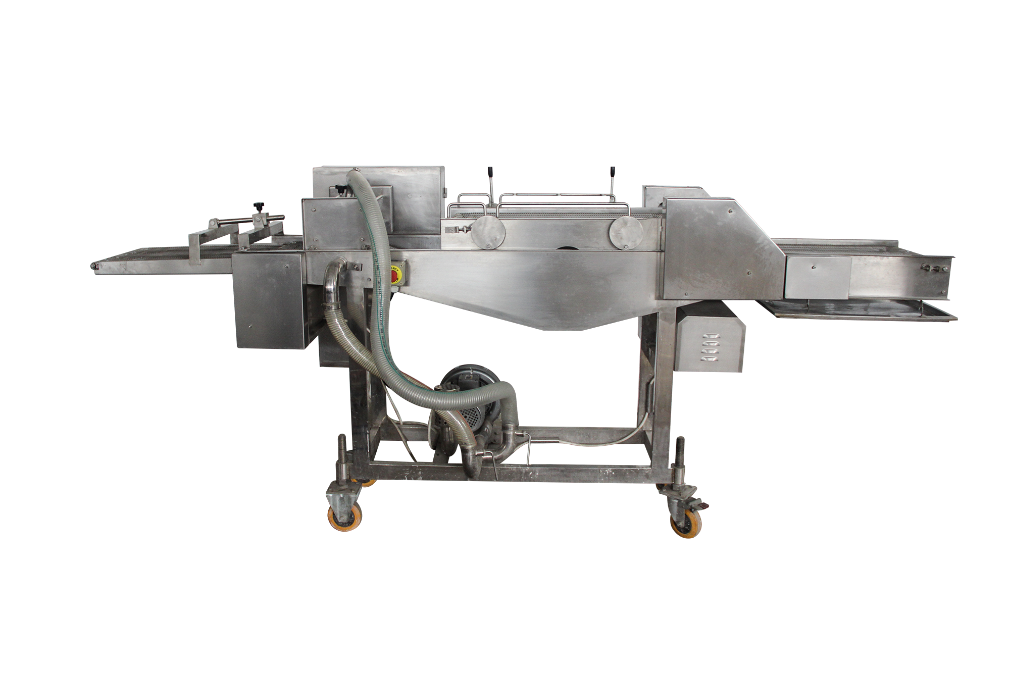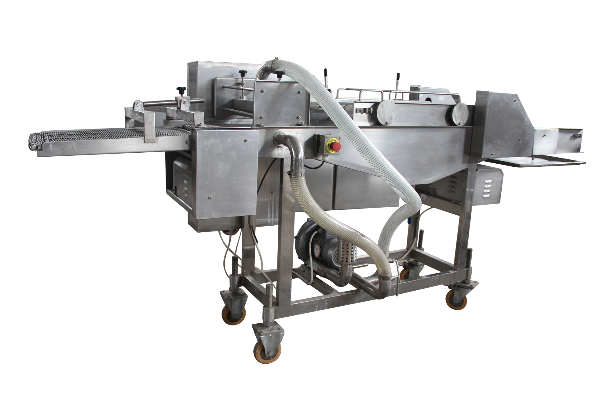 濃漿機(jī)是產(chǎn)品經(jīng)過上下輸送網(wǎng)帶夾持,在漿液中產(chǎn)品均勻粘附面漿。通過強(qiáng)有力的風(fēng)刀時,把多余的漿液被吹落。防止多余的漿液然后輸入到下一工序。產(chǎn)品適合于天婦羅產(chǎn)品和裹濃漿產(chǎn)品。