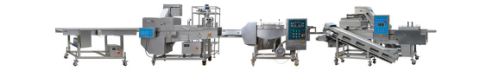 面包蝦生產(chǎn)線把蝦或者其他海產(chǎn)品經(jīng)上粉,上稠漿,上鮮康,油炸,速凍等工藝做出裹粉的炸雞腿。面包蝦生產(chǎn)線的需要配置前處理設(shè)備和后處理設(shè)備:油炸,包裝等設(shè)備,