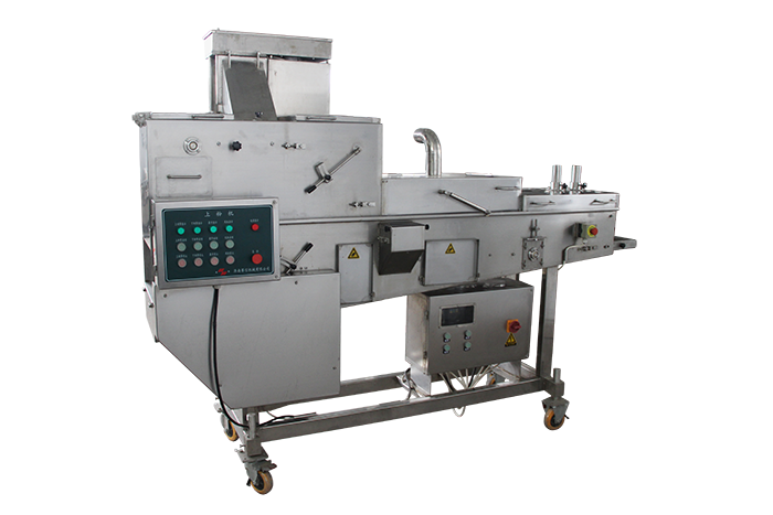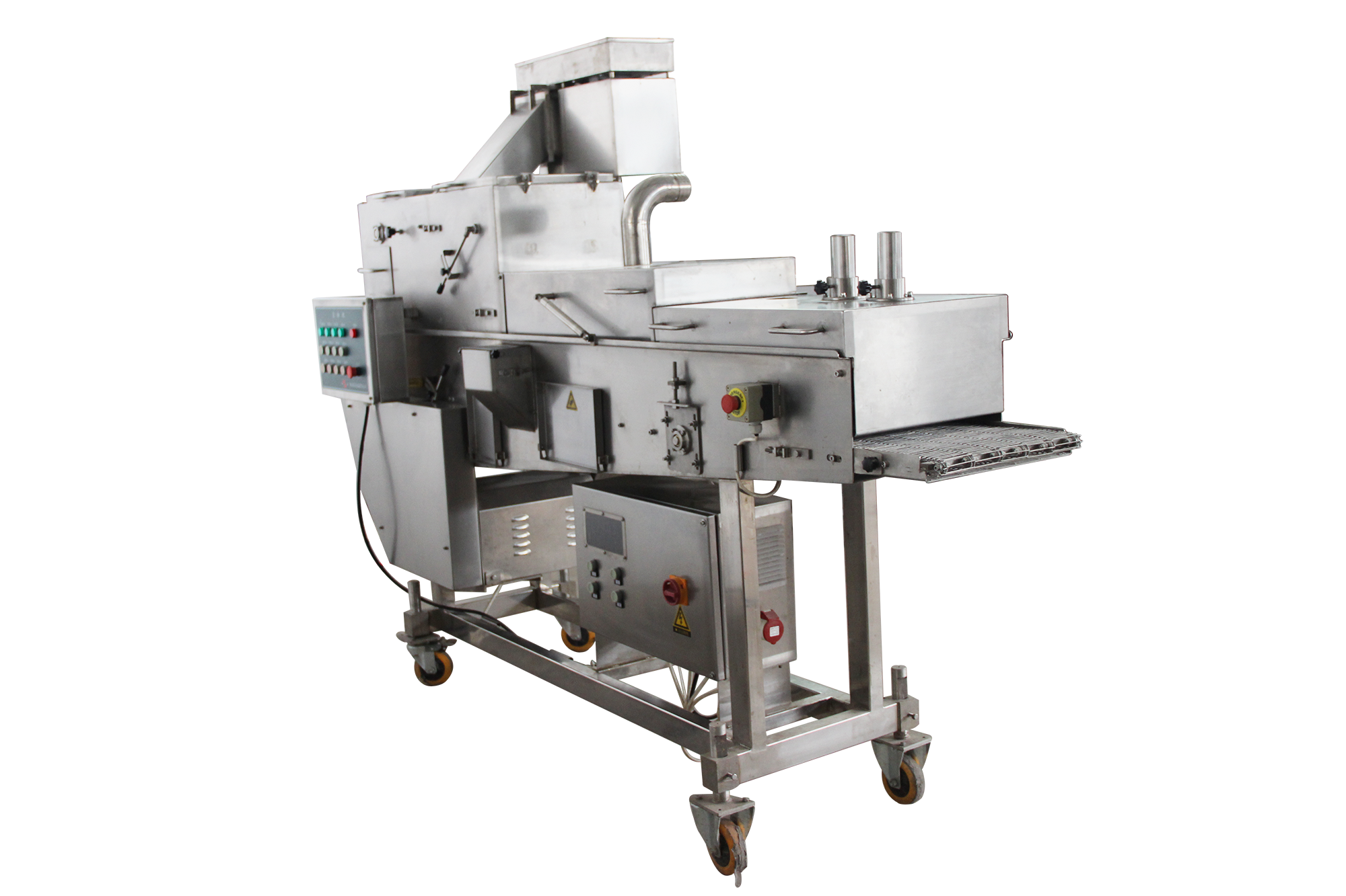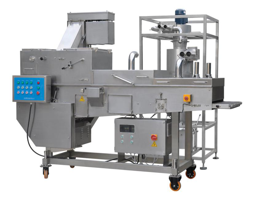裹粉機(jī)能自動(dòng)完成產(chǎn)品的上粉過(guò)程,適用于各種預(yù)上粉、混合粉等。產(chǎn)品進(jìn)入下網(wǎng)帶,底部及側(cè)面沾滿(mǎn)粉,從上料斗流下的粉將產(chǎn)品上部覆蓋,經(jīng)壓輥壓緊(上下網(wǎng)帶上的粉厚度可以方便調(diào)節(jié)),上粉后經(jīng)過(guò)風(fēng)管,將多余的粉吹落。進(jìn)入下一道程序。產(chǎn)品通過(guò)傳送網(wǎng)帶時(shí)被均勻的裹涂上一層混合粉,以適應(yīng)下道工序的要求,可以同上漿機(jī)、上面包屑機(jī)連接,組成不同產(chǎn)品的生產(chǎn)線(xiàn)。從而完成粉、漿、粉,漿、粉及漿、粉、粉工藝。