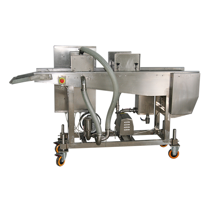 上稀漿機是通過漿幕和下部的承漿板把漿液均勻粘附在產(chǎn)品上,通過風刀時,多余的漿液被吹掉。然后輸入到下一工序。淋漿機適用于上面包屑和上粉前的工藝。雞塊掛漿機適合于雞肉、牛肉、豬肉、魚、蝦等海鮮產(chǎn)品,雞塊裹漿機可以對市場上流行的雞腿,雞排,魚排,漢堡肉餅、麥樂雞塊、魚香漢堡肉餅、土豆餅、南瓜餅、肉串等產(chǎn)品進行上漿處理,是食品工廠理想的上漿設備。