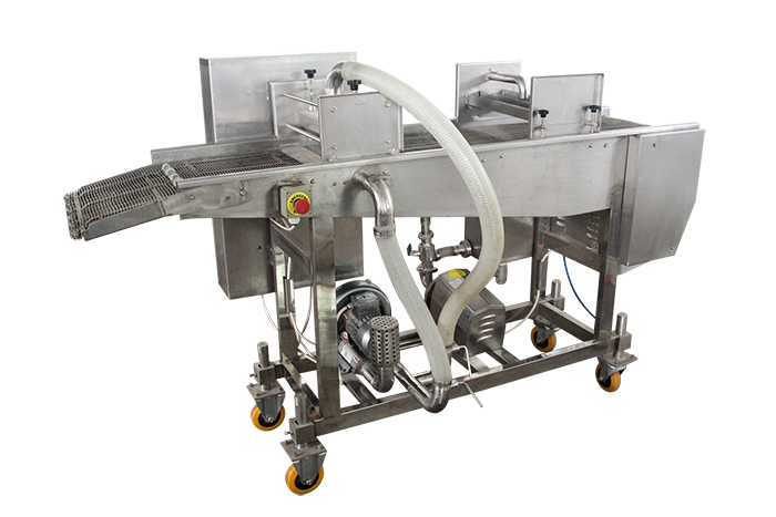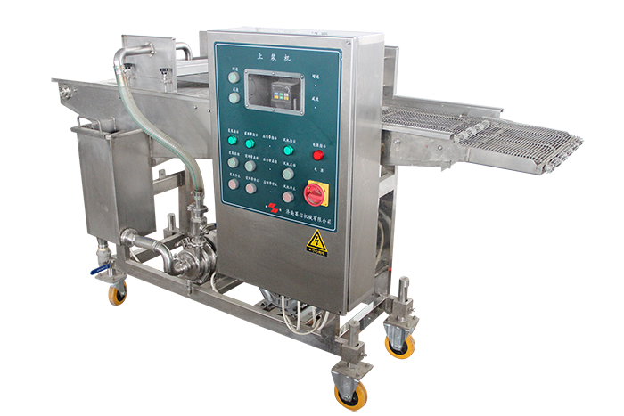 自動(dòng)淋漿機(jī)是通過漿幕和下部的承漿板把漿液均勻粘附在產(chǎn)品上,通過風(fēng)刀時(shí),多余的漿液被吹掉。然后輸入到下一工序。掛槳機(jī)可以與成型機(jī),上粉機(jī),上康機(jī) 等不同設(shè)備組成不同的流水線。雞塊掛漿機(jī)適合于雞肉、牛肉、豬肉、魚、蝦等海鮮產(chǎn)品,雞腿上漿機(jī)可以對市場上流行的雞腿,雞排,魚排,漢堡肉餅、麥樂雞塊、魚香漢堡肉餅、土豆餅、南瓜餅、肉串等產(chǎn)品進(jìn)行上漿處理,是食品工廠理想的上漿設(shè)備。
